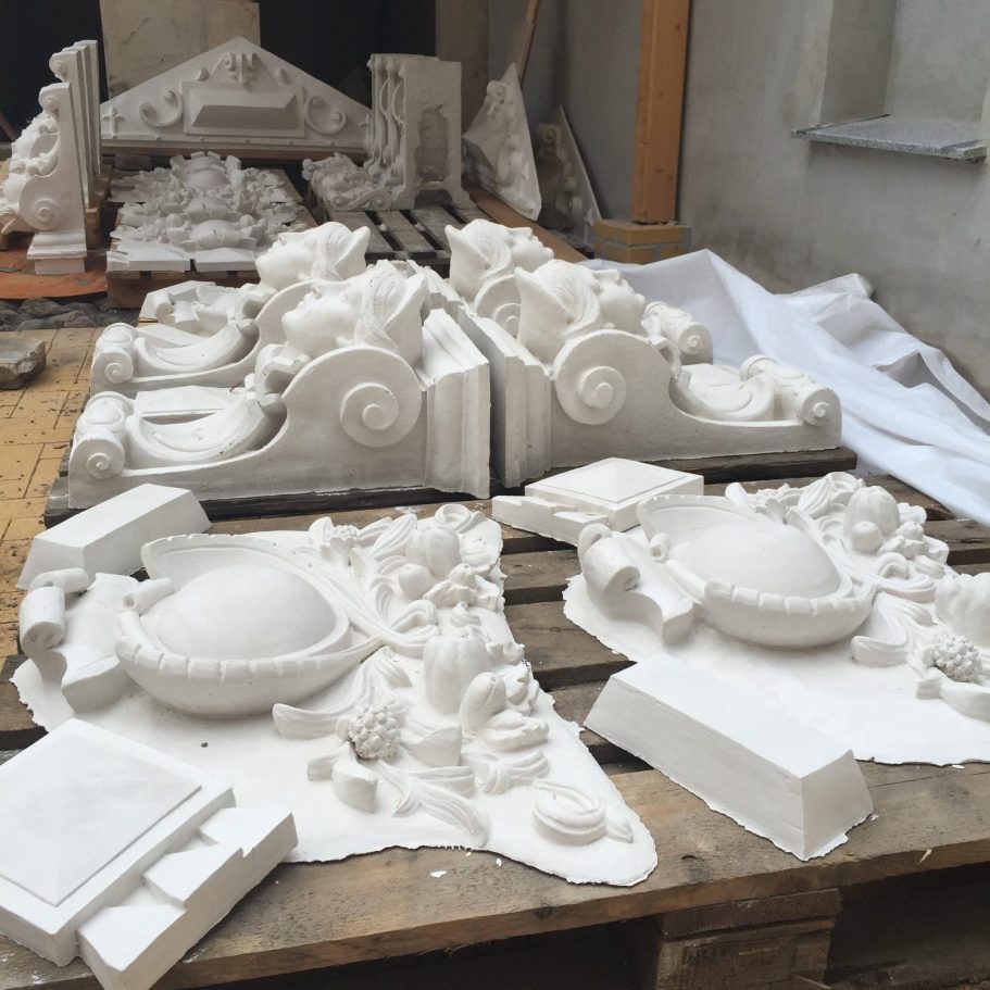 Herstellung von Gipsmodellen und Formen für Stuckelemente.